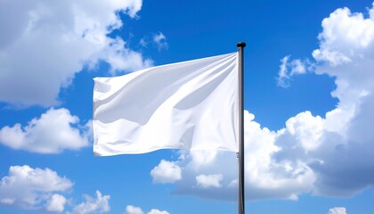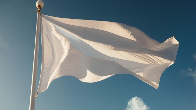 A white flag waving gently in the breeze on a sunny day, suitable for use as a symbol of surrender or truce