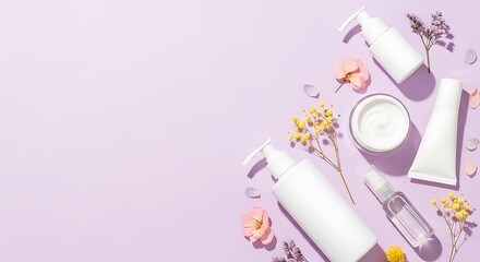 Flat lay of white cosmetic containers, pump bottles, cream jar, and dropper, surrounded by dried flowers on a soft lavender background