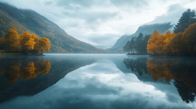 Scenic lake surrounded by rocky mountains and autumn foliage