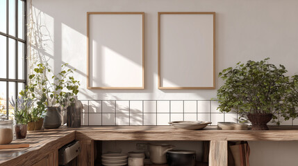 Mockup of two poster frames in bright kitchen, rustic decor, sunlit environment