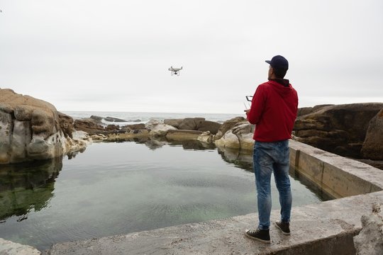 Man operating a flying drone