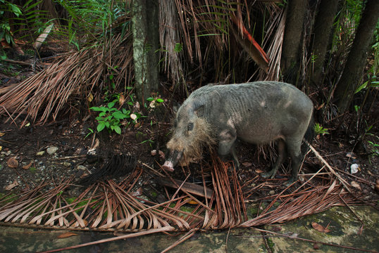 Burnaska bearded pig sus Barbatus in Bako national Park in search of food in the sand, Kuching, Malaysia, Borneo