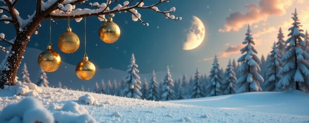 Golden ornaments suspended in mid-air above a snowy landscape with bare trees and a crescent moon, winter, holiday season