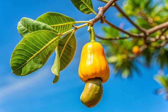 A vibrant youthful and ripe green mango fruit is suspended from a tree in an organic farm creating a picturesque scene with copy space image