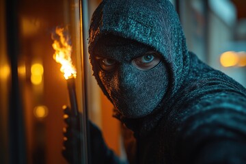 Mysterious hooded figure holding a lit candle in a dark eerie forest with foggy background creating suspenseful and spooky atmosphere for horror themed scene