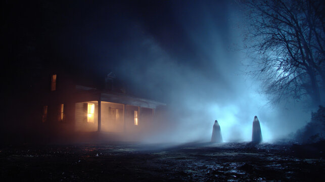 Haunted house with spooky night fog eerie shadows dark atmosphere mysterious silhouette creepy outdoor scene abandoned building chilling landscape suspenseful night photography