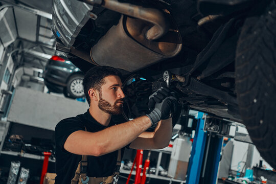 Car mechanic worker repairing suspension of lifted automobile at auto repair garage shop station
