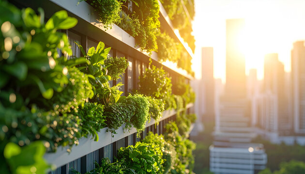 Green Building Facade with Vertical Gardens and Large Glass Windows for Sustainable Architecture
