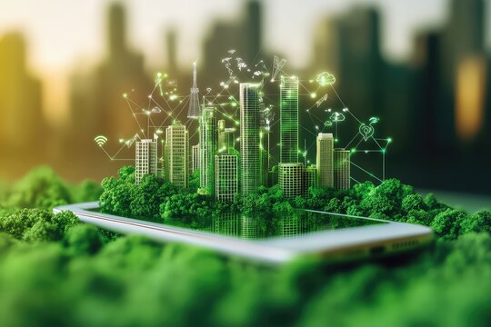 Sustainability and ecology icons overlayed on coastal cityscape