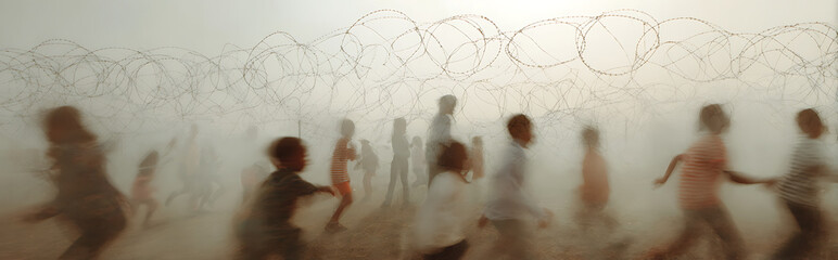 Double exposure silhouette of barbed wire with transparent overlay of diverse children playing in slow motion, vintage faded filter effect, conceptual contrast of freedom and restriction.