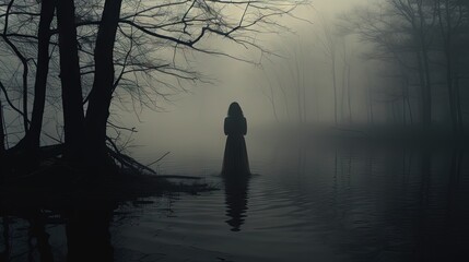 A Silhouetted Forest Reflecting on a Still, Foggy Lake
