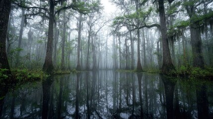 of a dense swamp forest with twisting vines and murky waters, swamp, forest,dense, twisting vines, murky waters, nature