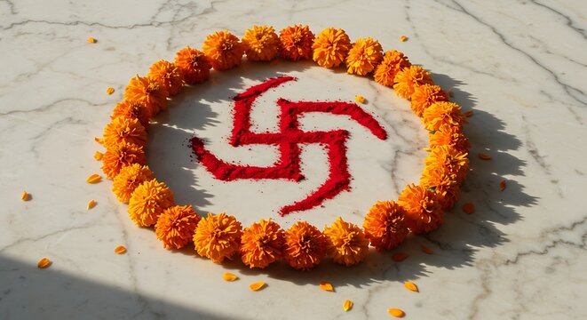 A red Swastika symbol drawn in sand is surrounded by a circle of orange marigold flowers on a marble surface.
