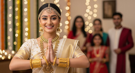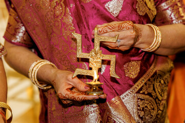 Close-up of a woman in traditional saree holding a golden Hindu swastika diya lamp with burning flame, symbolizing prosperity, spirituality, and sacred rituals in Indian culture