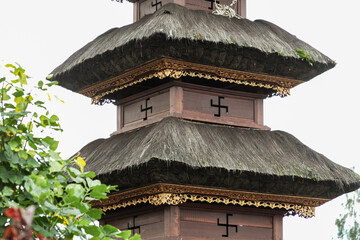 Japanese traditional ablution pavilion adorned with a carved Buddhist swastika cross.