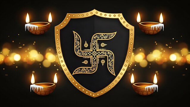 Golden Swastika Symbol on Shield Surrounded by Diya Lamps and Bokeh Lights auspicious Hinduism