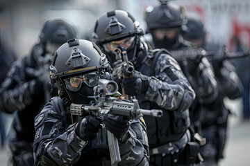 Photo of SWAT team on duty shot during operation. Concept Law Enforcement, Special Weapons and Tactics, SWAT Operation, Tactical Gear, Urban Warfare