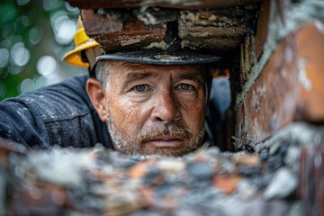 A close-up shot of a red broom sweeping a wet floor during heavy rainfall, capturing the intricate details of water droplets on the bristles and reflections on the wet surface.