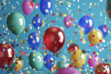 Balloons and confetti are flying in the air on a blue background