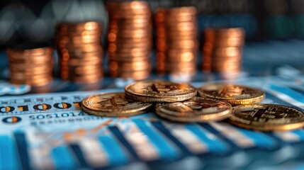 Coins stacked on a blue and white lottery ticket with more coins stacked in the background.