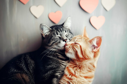 Two cute cats in love on a neutral background with hearts.