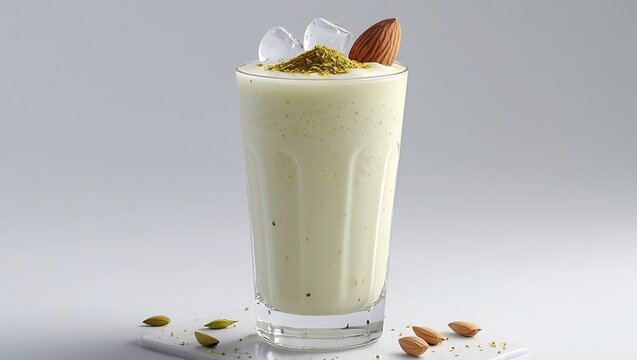 Ultra-HD Sweet Lassi in Elegant Glass | Photorealistic Chilled Beverage with Cardamom and Almond Garnish"