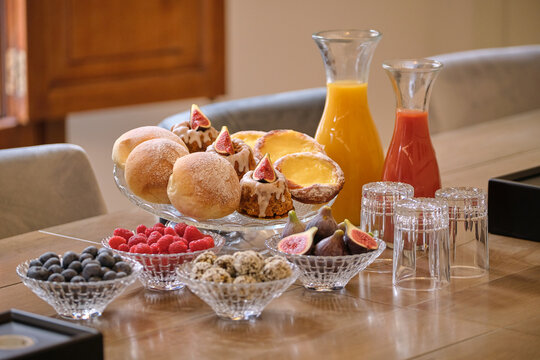 Buffet set with sweet pastry and mini burgers arranged near fresh fruits and berries on table with natural drinks in hotel restaurant