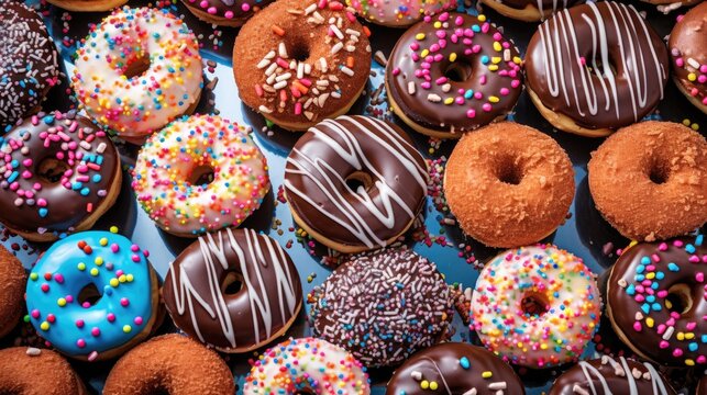 An assortment of donuts covered with colorful glaze and sprinkles at a candy store. Make your choice. A sweet for breakfast. Illustration for banner, poster, cover, brochure, advertising or marketing.