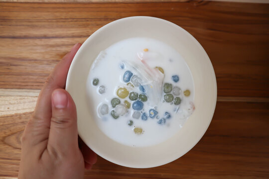 Kanom Chan or Steamed Layer cake. Thai traditional dessert. Layer sweet cake made in the shape of rose on wooden background.Top view