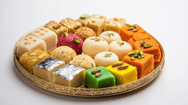 Colorful Deepavali sweets arranged on a decorative plate