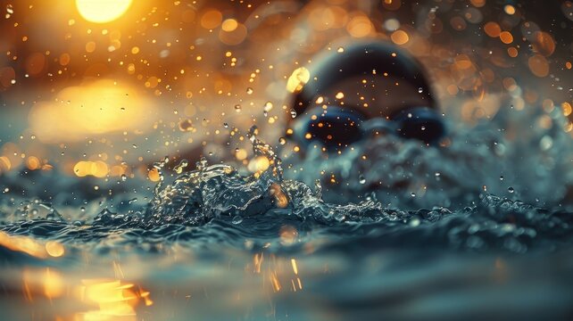 A swimmer cuts through the water, propelled by the setting sun and their own determination.  The water sparkles with sunlight, creating a sense of energy and motion.