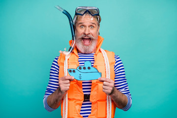 Photo of crazy aged seaman bottom underwater breathing tube mask excited diver hold paper ship wear striped sailor shirt orange life vest isolated teal color background