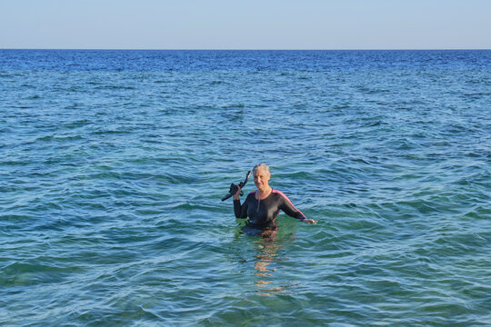 Senior female swimmer holds mask and snorkel while standing in blue sea water