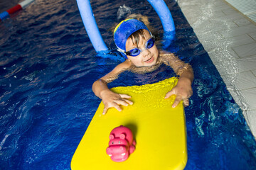 Young swimmer practices skills with a bright flotation board and toy in a training session at the local pool