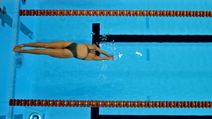 Aerial view of a swimmer diving into a pool, highlighting the sport's elegance and precision.