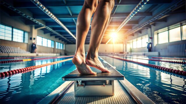 Swimmer preparing to dive from starting block. Professional athlete ready for race. Concept of competition, fitness, sports.