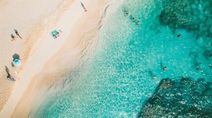 Aerial view of a serene beach, where turquoise waters gently meet the soft, sandy shore with a few scattered sunbathers and swimmers enjoying the day.