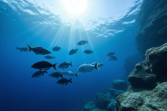 Lively capture of tropical fish swimming among coral reefs in clear waters