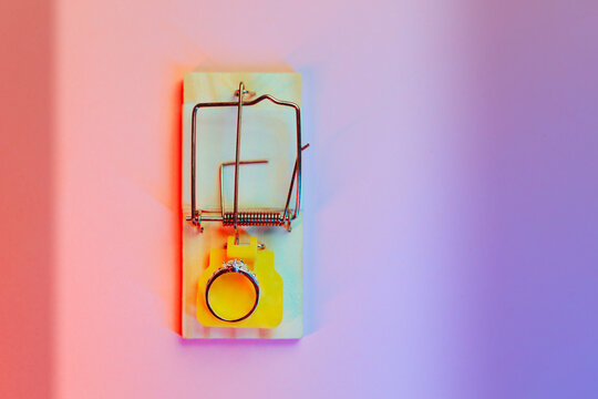 Engagement Ring in the Mousetrap to Catch Romantic Partner. Swindler scammer trying to capture a victim of love