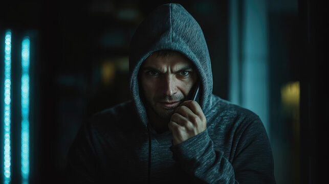 male scammer in hoodie talking on phone on dark background, man, criminal, thief, bandit, killer, fraud, deception, scam, eyes, face, angry, cunning, evil, smirk, portrait, emotion, person, people