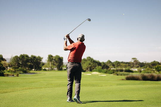 Confident golfer swinging on fairway with overlaying graph