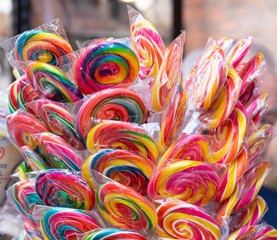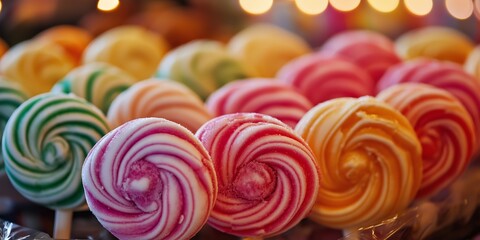 Bright and colorful swirl lollipops in various colors and designs are displayed attractively in a candy store setting.