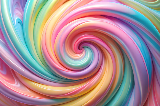 Closeup macro view of a colorful pastel rainbow swirl resembling a giant lollipop or sweet candy, with smooth glossy texture and playful design