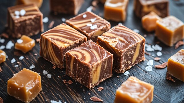 Fudge with caramel swirl and sea salt, on a dark wooden board, surrounded by caramel cubes and sea salt flakes