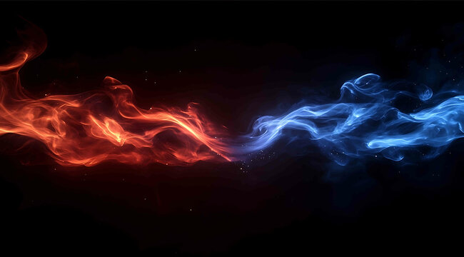 An image of two flames colliding one blue and the other red The background is dark with a hint of light There should be smoke around them Use a highresolution animation style to dep