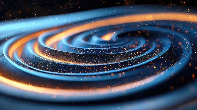 An abstract image of a swirling spiral with blue and orange colors, and glowing particles.