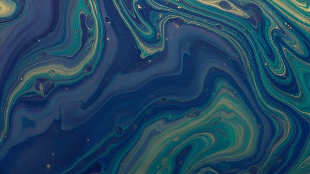 Abstract Fluid Art of Navy Blue Teal and Gold Marbling with Glittering Highlights Creating an Elegant and Swirling Background for Creative Projects
