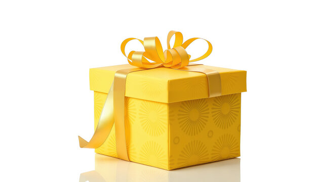 Gift Container Lemon yellow with sunburst patterns, swirling ribbon, isolated transparent background, vibrant advertisement style.