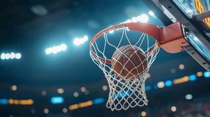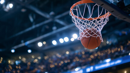 Close-up of a basketball swishing through the hoop, net rippling, bright arena lights illuminating the ball, blurred cheering audience in the background, motion and excitement capt