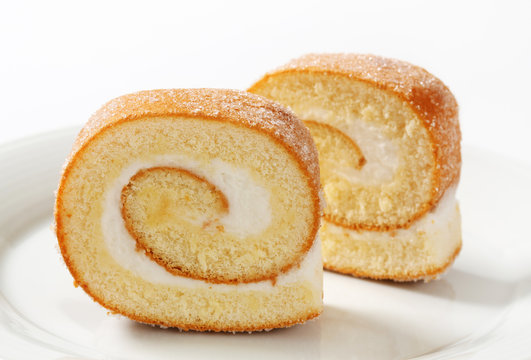 Sponge cake roll slices isolated on white background, with chocolate, vanilla and berry cream, different swiss rolls collection